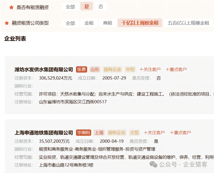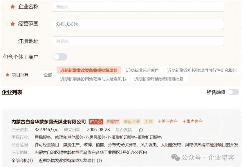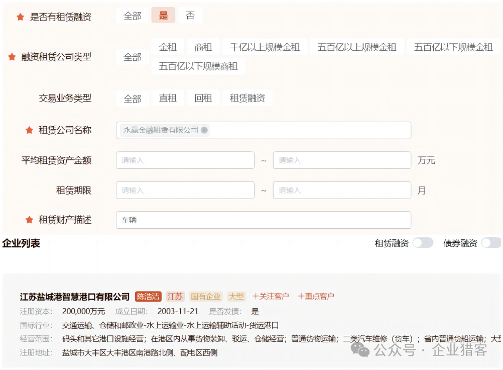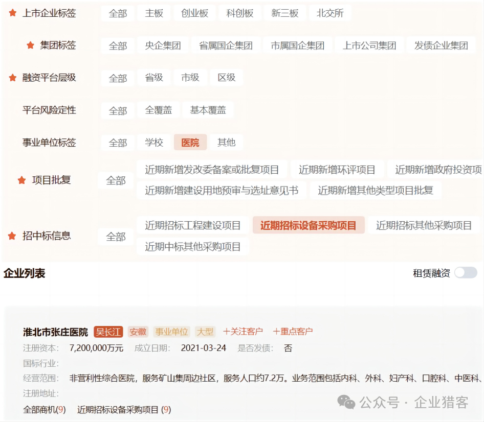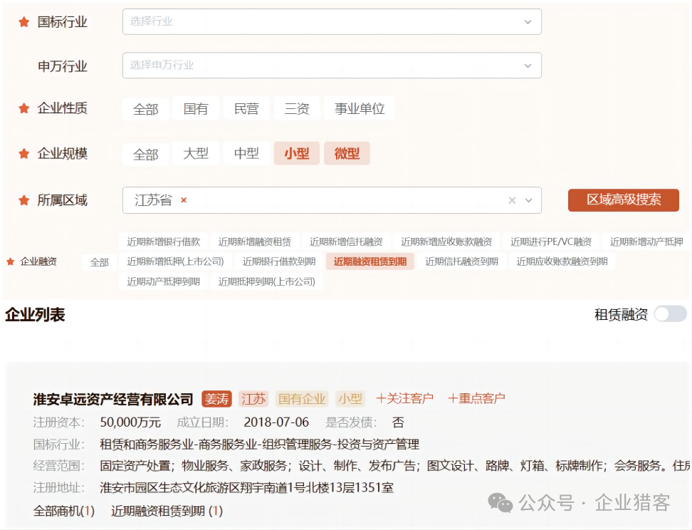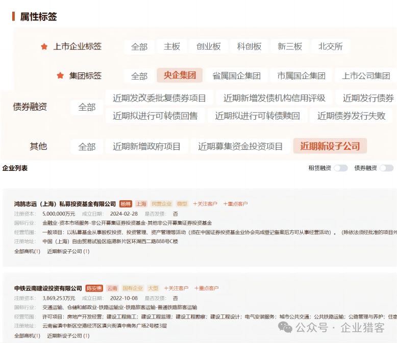以上数据均可从猎客平台的企业搜库功能进行查询导出,企业搜库提供200+的企业标签,30+的商机标签,可以做各种自由组合,来筛选有明确资金需求的白名单客户。