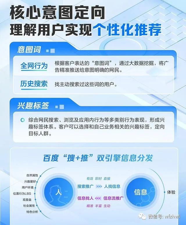 根据客户主动搜索的关键词,基于人群属性、搜索意图、行为数据、兴趣爱好,在用户浏览百度信息流资讯时,精准推荐营销内容。