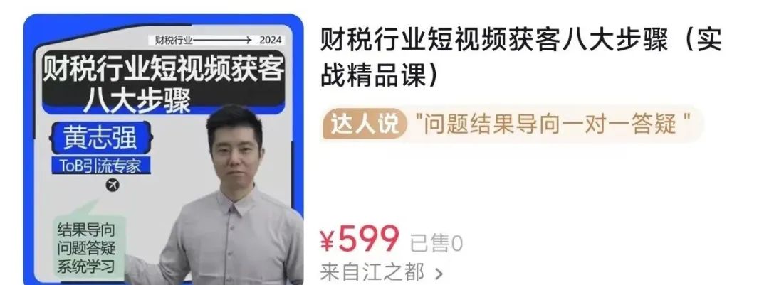 进入2024年,我们优化了这套短视频获客打法,使之更加符合广大中小型财税企业人手不足、经费有限的经营现状,并研究了大量的成功案例,参考了市面上同类的财税行业短视频获客教程,最终形成了一套更适合财税行业的短视频获客方法论,在抖音学浪平台上售价为599元。
