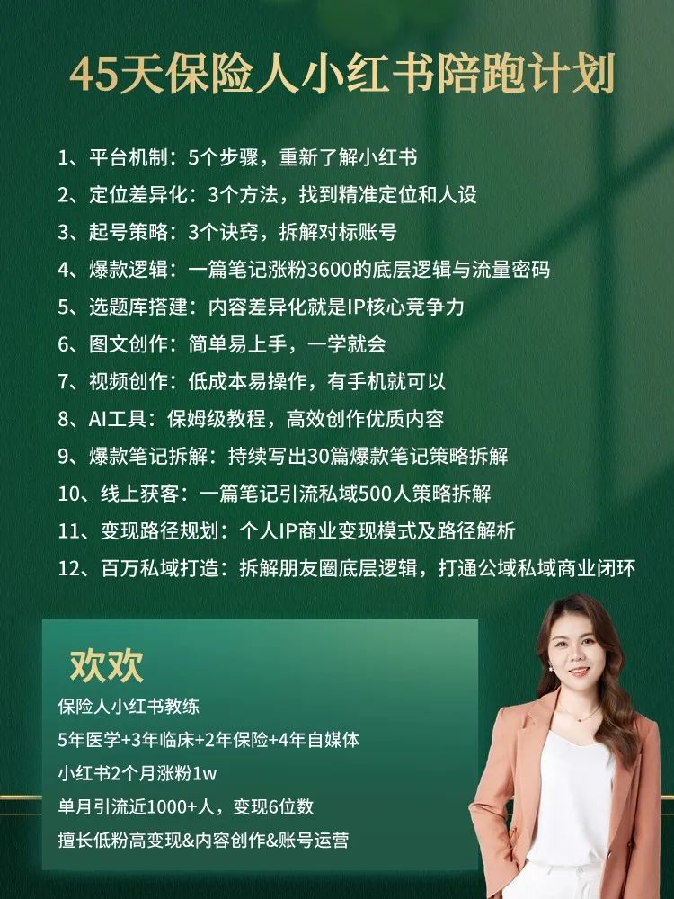 关于做自媒体,我开设了一门课程---【45天保险人小红书陪跑计划】,里面汇集了我2个月从0涨粉到1万,引流1000+的心法和技法除此之外,我特意针对保险人进行全新设计,提供落地可用的方法和技巧,提高保险人获客&增员效率欢迎添加我的微信:345348995,私信报名!!!