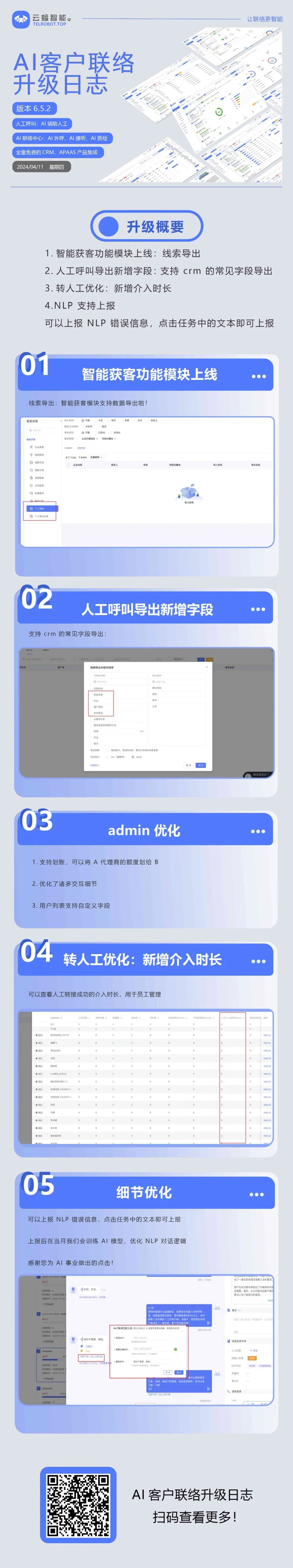 更多升级日志可以点击阅读原文或者复制以下链接跳转到云蝠智能帮助中心升级日志模块https://help.telrobot.top/查看!