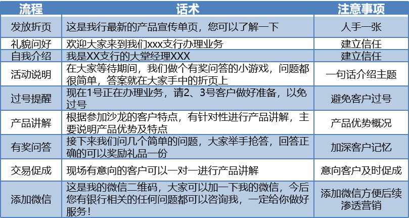 建议做好这三项工作:厅堂营销贵在工具吸引、柜面一句话贵在加微信、厅堂微沙龙贵在做促成,接下来我们逐一讲解。