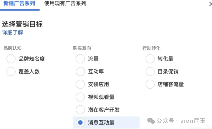 在Facebook上新建广告系列:在Facebook广告管理平台中,创建新的广告系列,并选择适合的营销目标。营销目标通常选择消息互动量,以便将广告投放给那些喜欢与消息互动的用户。