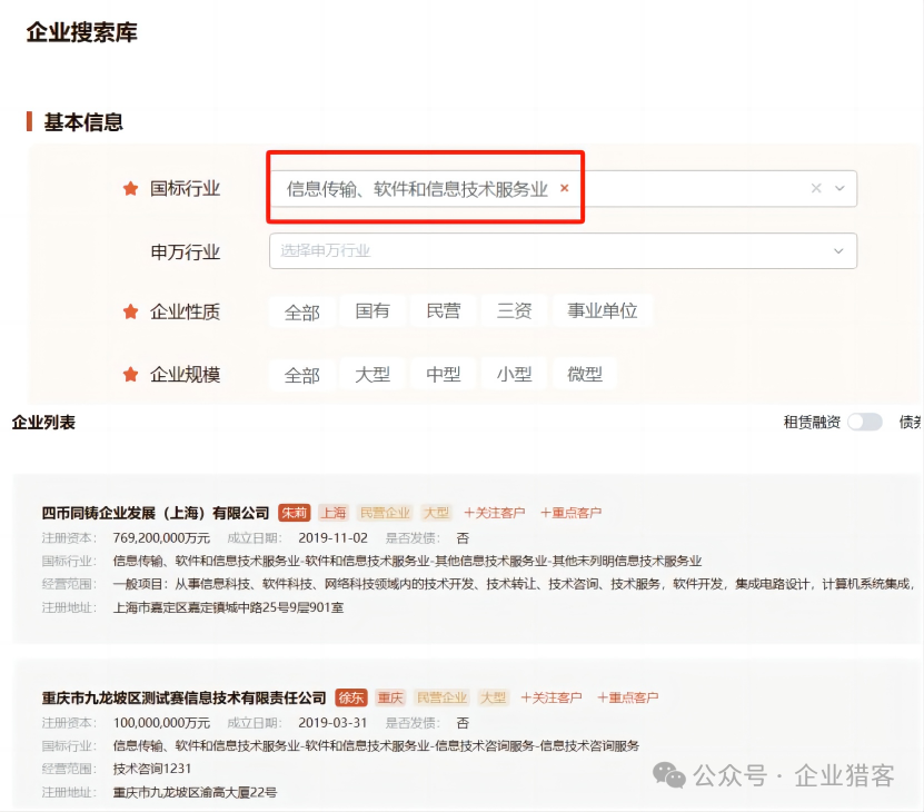 1.根据国标行业找企业:打开猎客APP-企业搜库-国标行业:选择“信息传输、软件和信息技术服务业”,查询导出。