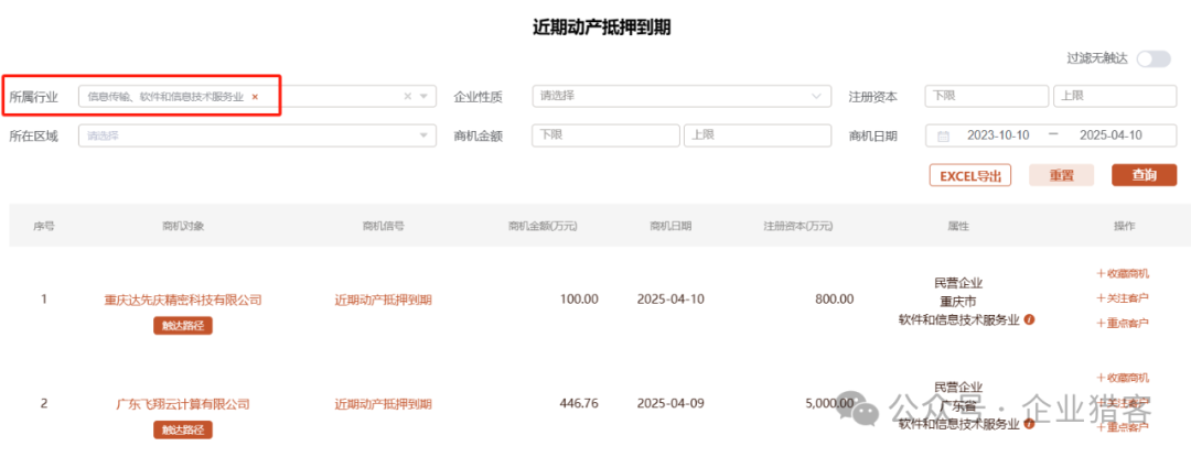 3.根据商机信号找商机:打开猎客APP的精选商机,商机信号选择“近期动产抵押到期”,行业选择“信息传输、软件和信息技术服务业”,查询导出。