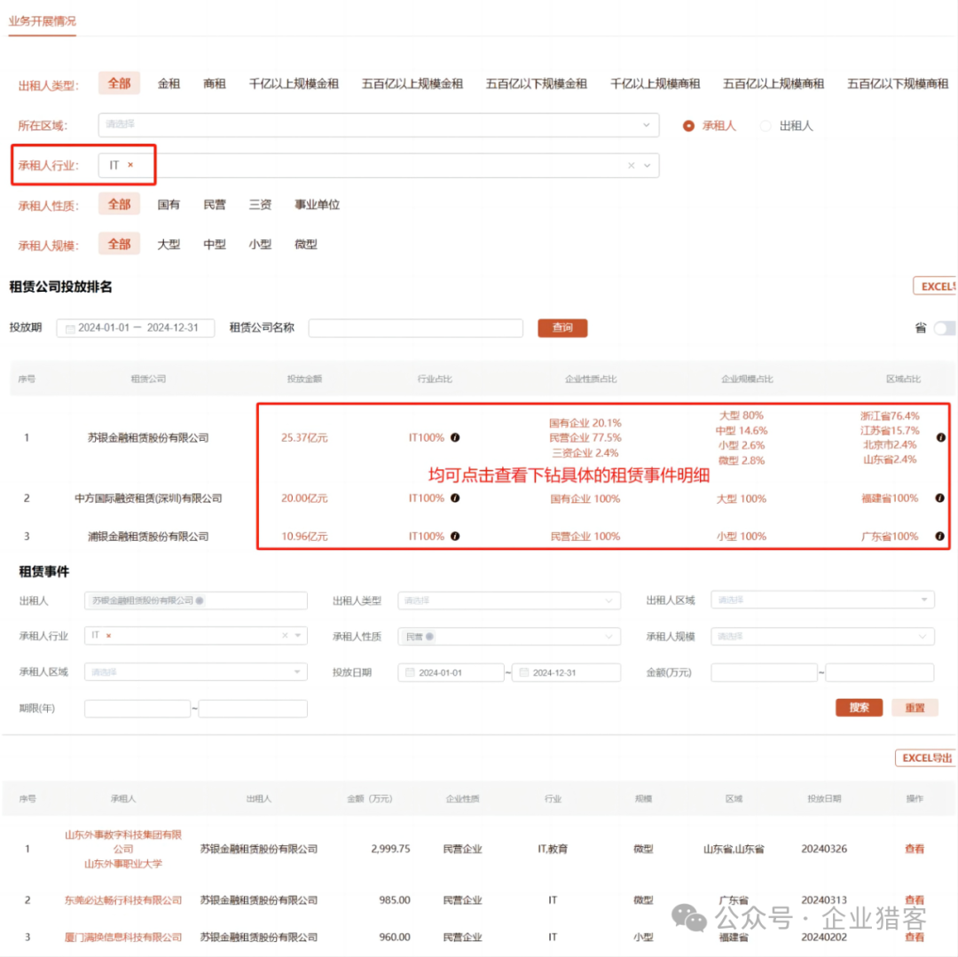 4.根据同业投放找商机:打开猎客APP的竞业看板,承租人行业选择IT,即可得到同业整体对IT行业的所有投放事件,我们可以定位到风险偏好和价格区间跟我们相似的租赁公司,查看他们具体在IT行业投放的业务明细