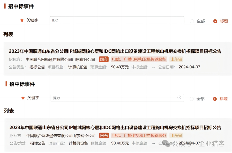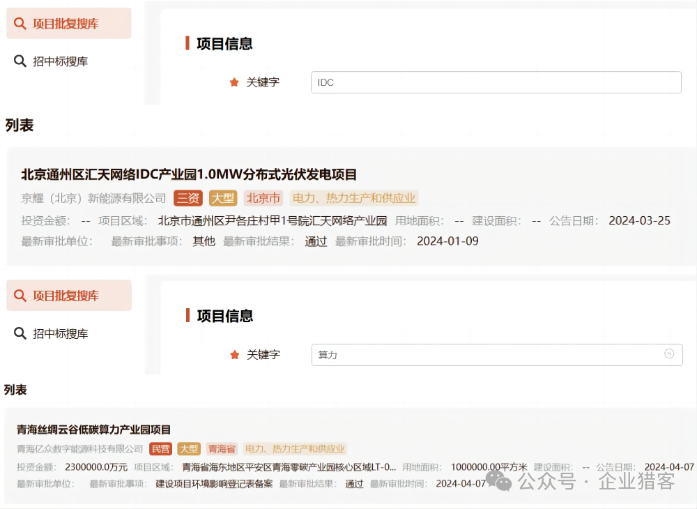 1.根据项目批复或招中标数据找商机:打开猎客APP-项目搜库-关键字-输入“IDC或算力”,查询导出。
