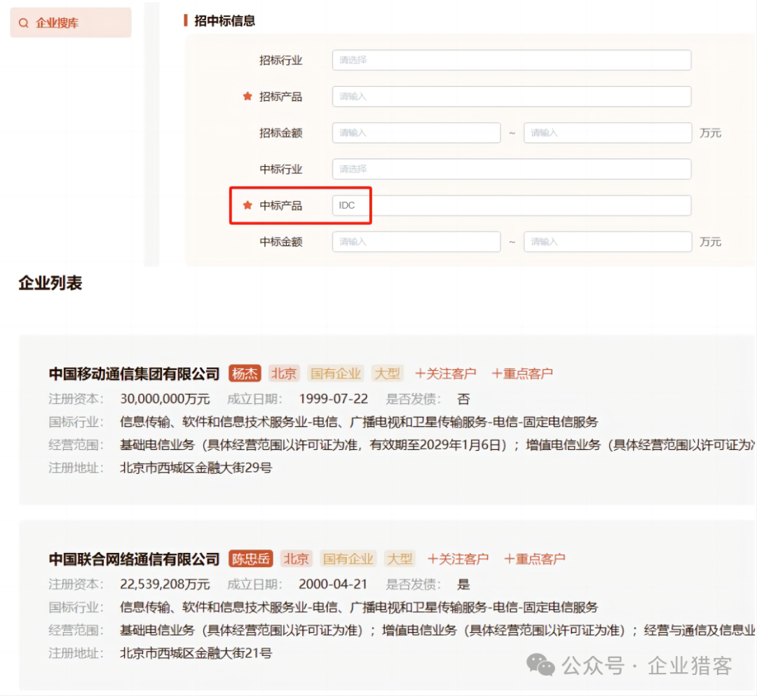 3.根据中标产品找企业:打开猎客APP-企业搜库-中标产品:输入“IDC”,查询导出。