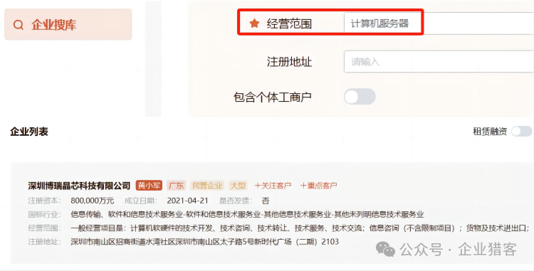 2.根据经营范围找企业:打开猎客APP-企业搜库-经营范围:输入“计算机服务器”,查询导出。