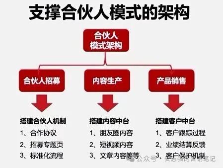 合伙人架构:合伙人招募-搭建合伙人机制(合作协议,招募专题页,标准化流程);内容生产-搭建内容中台(朋友圈内容,短视频内容,文章内容);销售产品-搭建客户中台(客户跟踪过程,业绩结算反馈,客户保护机制)