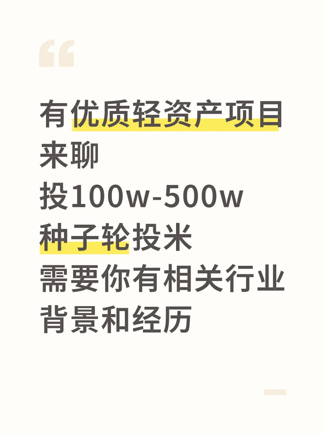 有优质轻资产项目来聊 优质轻资产创始人们来聊AI、宠物、银发经济、社交、本地生活、二次元、校园等赛道都可以创始人团队要有行业认知有项目落地的能力有可规模化的商业模式,有15页内的商业计划书欢迎来聊每个项目可投100w-500w#资本 #创业 #项目 #投资人 #投资 #ai#宠物赛道的 #轻资产创 #创始人 #创业交流