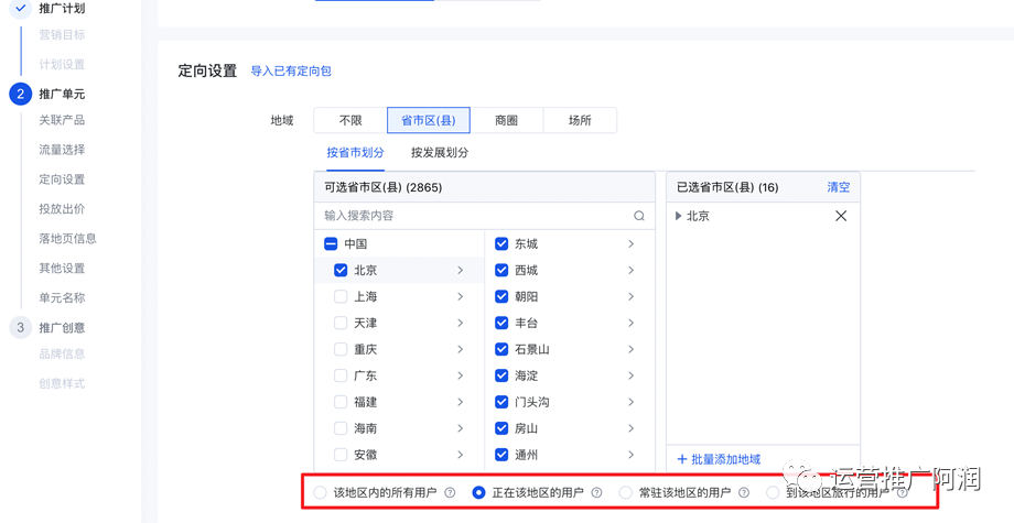 单元层级&定向包推广地域设置新增「该地区内的所有用户」、「正在该地区的用户」、「常驻该地区的用户」、「到该地区旅行的用户」四种选项: