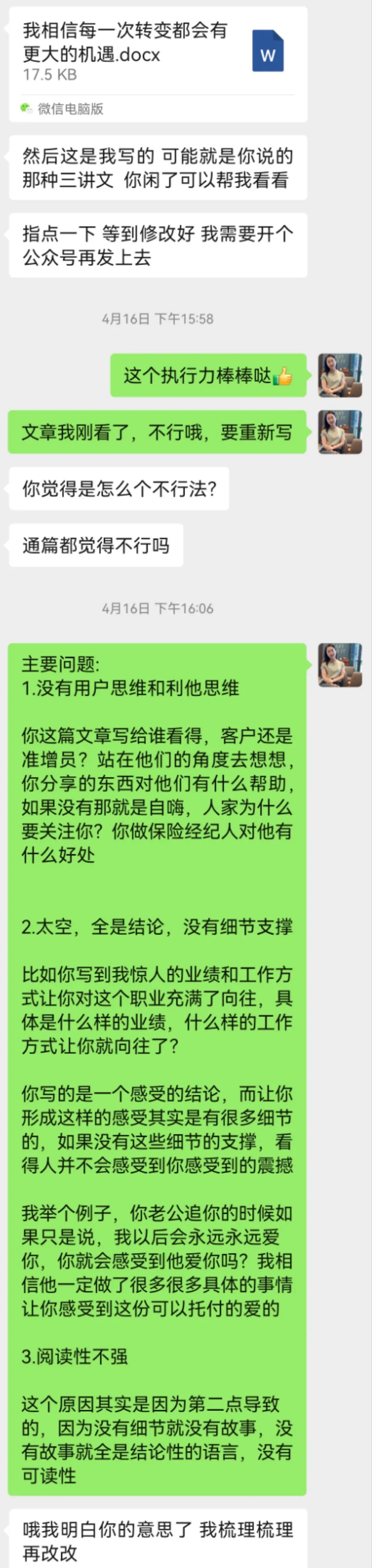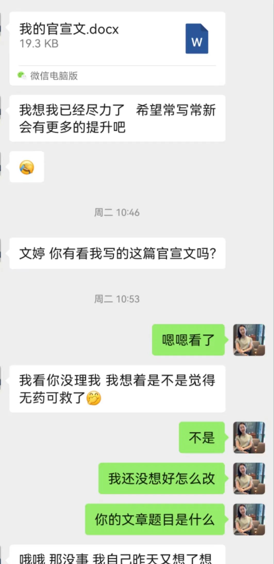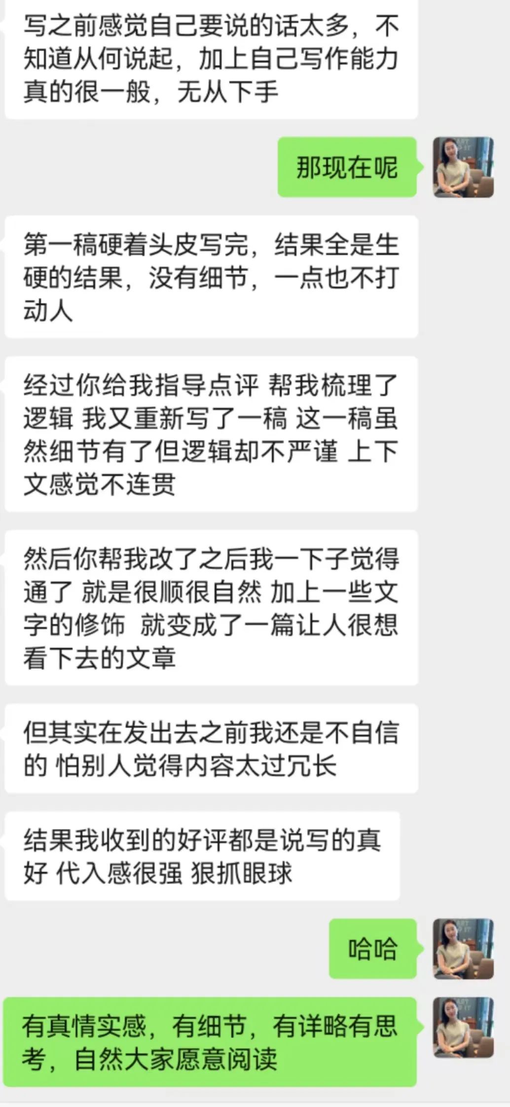官宣文的好坏与文笔本身没有太大关系,就像我指导的这位新人,文章里面的内容还是她本人写的,故事也是她真实的故事,思考也是她自己的,我做的只是帮她去理清楚,帮她想清楚,最后清晰表达。