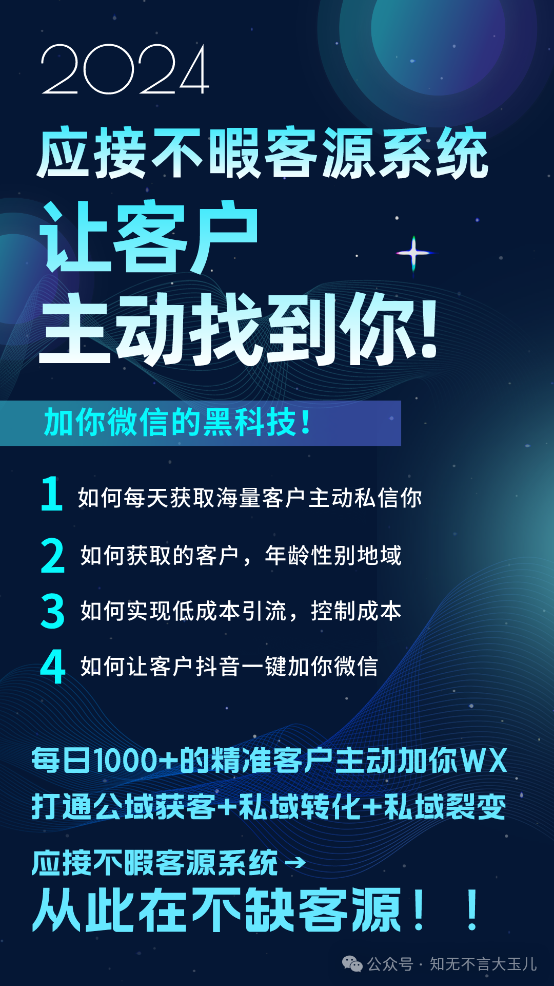 在市场竞争日益激烈的今天,如何才能在众多企业中脱颖而出?答案就是实现获客的重大突破。而“应接不暇获客系统”正是这样一种能够帮助企业实现这一目标的强大工具。它不仅能够让企业在短时间内获得大量精准客户,还能够通过精细化的运营和转化策略,将潜在客户转化为忠实用户,从而实现企业业务的快速增长。