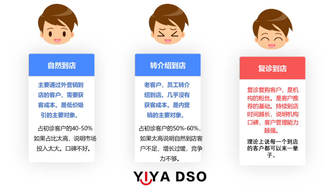 以上三类客户组成了一家口腔医疗机构的“门诊量”。对一家“老店”而言自然到店约占总门诊量的5%-10%,转介绍约占15-20%,复诊客户则占60-80%。而对一家新店而言可能自然到店占了70%,转介绍几乎没有,复诊约在20-30%。