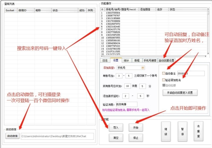 通过软件搜索出来的客户信息,可以一键导入系统,通过软件自动添加微信,可以同时扫码登录一百个微信同时添加,互不冲突,每发出一个好友请求会自动切换一个IP,完全模拟人工操作,自动回复,自动备注,验证语自动加对方姓名,通过率高!