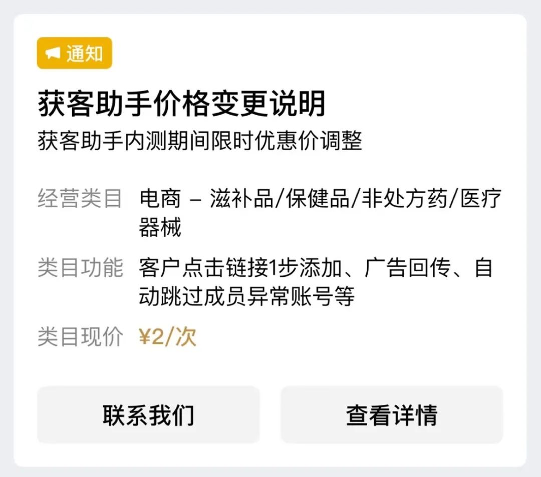 在新的价格变更通知里能够看到,目前获客助手的价格仍处于限时优惠价中。