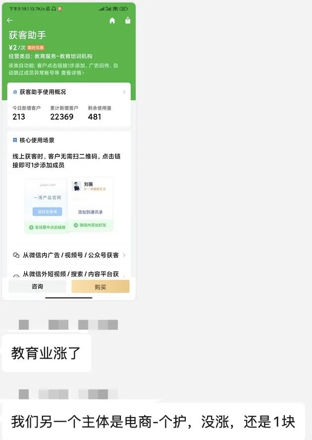 在见实会员群中有品牌提及,他们是先认证了自己所属经营类目后,发现价格为2元,而没有认证经营类目的则仍然保留原价。照此推测,未来获客助手或也将变成通用版(未验证经营类目),和增强版(验证经营类目,并对应提供相应行业的增强型功能)。