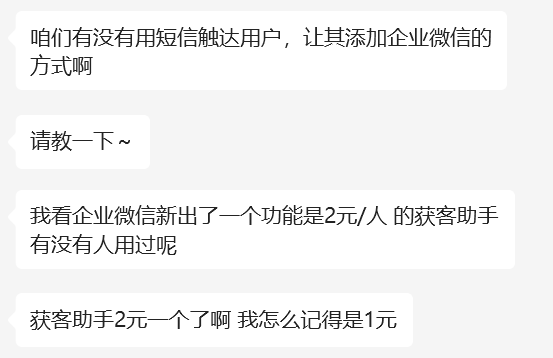 前几天,见实会员群里进行了一段有意思的对话,两个品牌私域运营负责人在聊天中,发现双方获客助手价格不一,一个是收费1元/人,另一个则涨到了2元/人。
