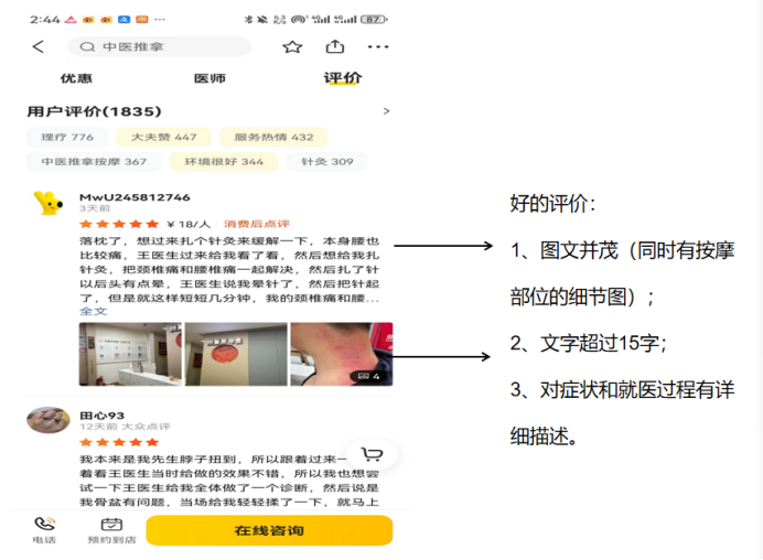 (2)配图数量和质量。评价需要搭配3到9张图片,且图片质量要高;(3)浏览轨迹和时长。用户在评价前应有同行的浏览轨迹,且在店铺的浏览时长需超过1分钟;(4)间隔时长:买单和验券的间隔时长应适当,以体现服务的连贯性;(5)评价时间:建议购买团购后隔天再写评价,以保证体验记忆犹新;(6)评价来源:千万不要搜索店铺进行评价,以免被认定为无效评价;(7)评价内容:评价内容应积极正面,语句通顺,无大量重复词语或错别字;(8)星级评分:评价需要带有星级评分,且评分内容不能少于15个文字,不能包含广告内容,也不能是重复抄袭的评价账号。评价账号不能有违规行为。