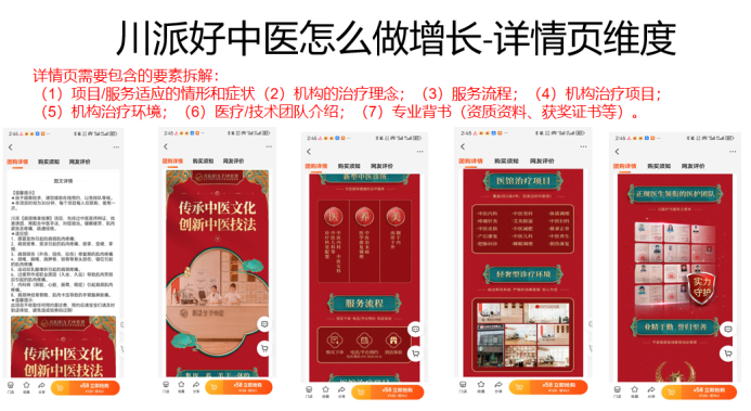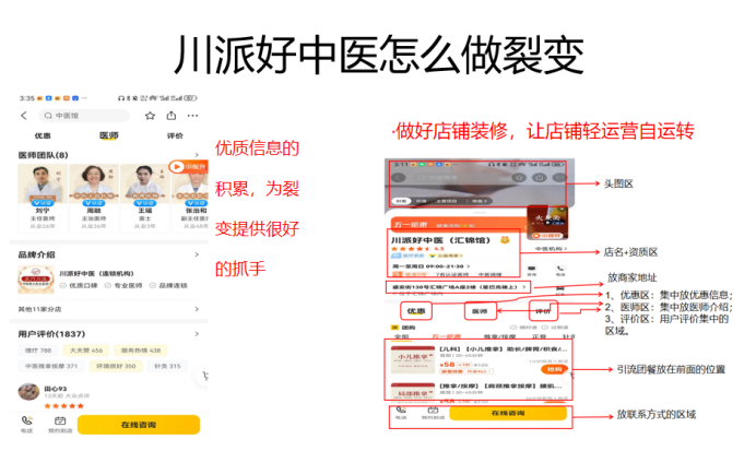 裂变的本质就是人传人,裂变的前提是优质产品和服务。而美团作为一个优质的公域平台,就为机构在平台裂变提供了良好的土壤。潜在用户选择医疗机构,永远是基于口碑做出选择,而非基于利益做出选择。当他能接受到的信息告诉他“这是一个优质机构”,他就会选择这个机构。可以露出关键信息的地方包括: