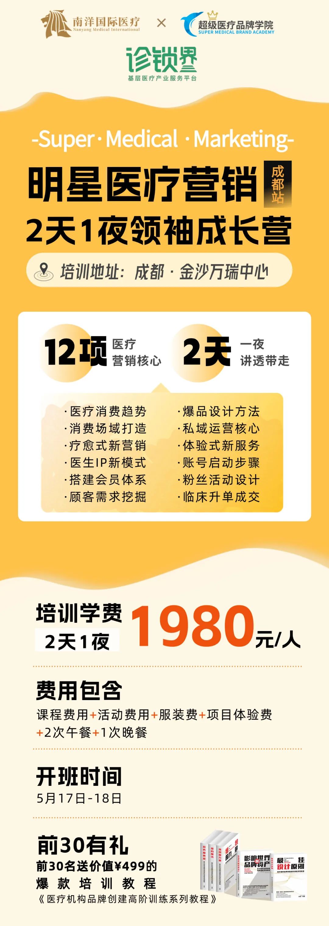 美团也给了大家很多很实用的功能模块,帮助大家高效获客。本文分享了整体思路和操作方法,当然在实际操作中还有很多细节的问题,也欢迎大家文末浏览海报,报名【南洋医疗&诊锁界&承启堂】联合打造的线下成长营!在本次训练营中,作者将会带来围绕文章提到的美团口碑打造、获客等进行详细拆解的课程,带着问题来,带着方案走!5月17-18线下营,现场超多丰富消费医疗项目体验、实操专家分享、承启堂参观交流、科学系统的知识盛宴等,诚邀您的加入!