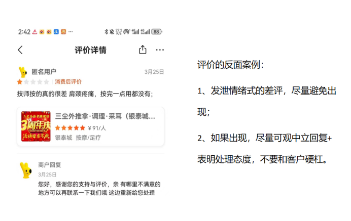 (4)美团店铺评分的计算是基于客户评价的综合分析,其中评价数量对分数的影响非常大。例如,一个新店铺在30日内如果收到7个5星好评,其评分会是5.0星。但是,如果这家店在同一时间内又收到2个1星差评,那么店铺的评分会下降到4.11星。一旦店铺在30日内收到差评,即使之后补充了大量的好评,分数也很难完全恢复,最高只能达到4.9星。因此,日常积累足够多的评价数量是抵消差评的最重要手段。