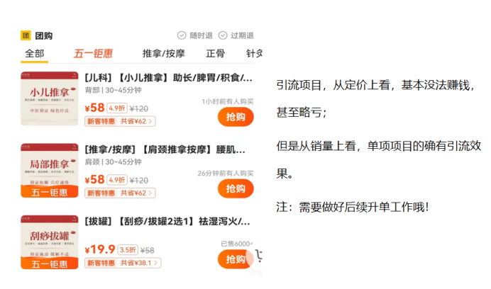 引流的含义,就是用低价的招牌团餐,把意向客户吸引到店,然后再带来后续消费的行为。因而引流的产品,价格不能太高,不然容易把潜在用户吓走。引流团餐的三要:
