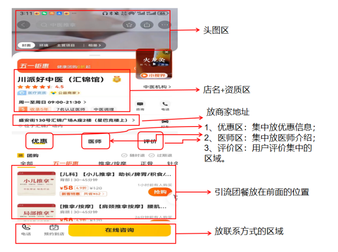 现实社会中,优质的医疗资源是稀缺资源,当一个人发现了优质的医疗资源时,是很容易当成一个社交货币,分享给其他的用户的。当公域的基础打好之后,公域的优质信息会慢慢带来复利效应。当机构想实现老带新这个功能的时候,可以直接转发机构的美团小程序(也可以同时给用户一些物质激励)。在优质的公域信息的基础上,实现老带新这个功能。机构在公域做好运营的一大标志,就是可以成功实现自运营,也就是在商家列表中排在一个比较靠前的位置。当机构的商家列表很靠前的时候,就可以在3公里的范围内获得最大的曝光,能让3公里以内的用户都知道机构的存在。那么对于商家来说,怎么才能在商家列表中获得更靠前的排名呢?这是一个比较复杂的话题,本文篇幅有限,在以后的文章中再详细阐述。好的店铺装修,可以让用户身临其境,联想到线下消费的场景:专业的医生/技师、亲切的护士、周到的医养服务……因此,好的店铺装修,不但需要体现专业性,也需要展现机构良好的服务能力。