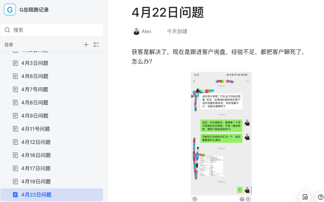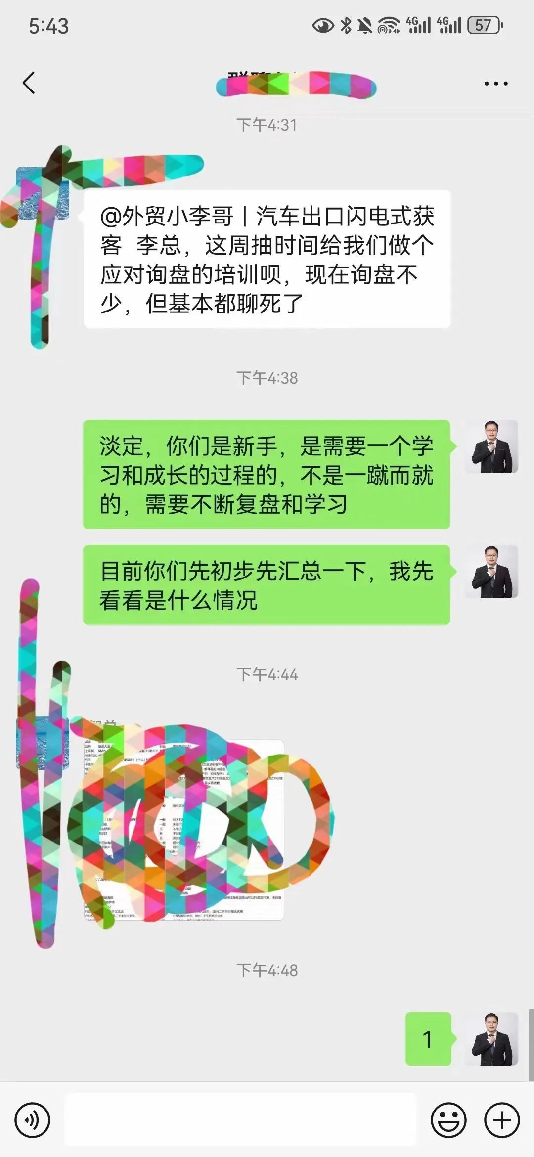 学汽车出口这个事情,一定是在线远程学习,因为你的问题都是在实操过程中缓慢出现和发现问题的,不是短短的两天一夜下课就能发现问题的。像之前的学员,他们参加完学习以后一般第1个月问题会比较多,有的学员可能1天都给你来个两三个问题都有可能。而1个月以后逐渐都已经掌握了,就问题就比较少,但是也会有,偶尔也会冒几个问题出来。综合起来看,两三个月之内,它都会有遇到不同的问题,大大小小的问题。所以说绝对不是什么三天两夜强化培训就能搞定的,线下培训是一听就会,一干就废,主要还是靠在实操中去解决问题。(如下图,上个月一位学员的陪跑记录,他们是获客解决后,不知道怎么跟进客户,这个也会教大家的)