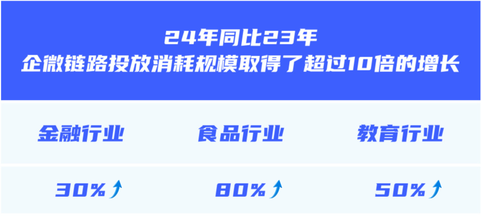 24年同比23年,企微链路投放消耗规模取得了超过10倍的增长。其中,金融行业30%、食品行业80%、教育行业也有超50%以上消耗均为企业微信链路。可见,企业微信链路正在成为vivo营销线索客户广告营销的新趋势。